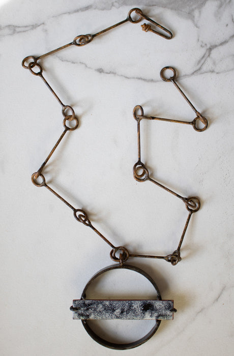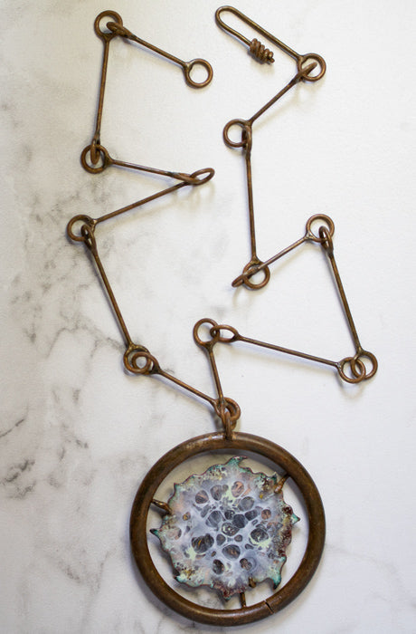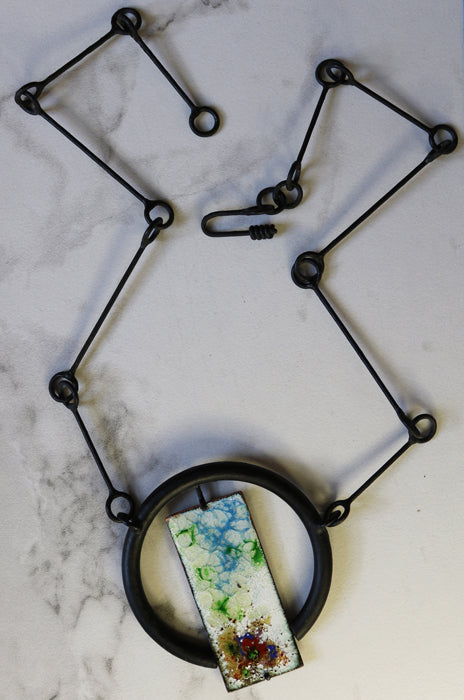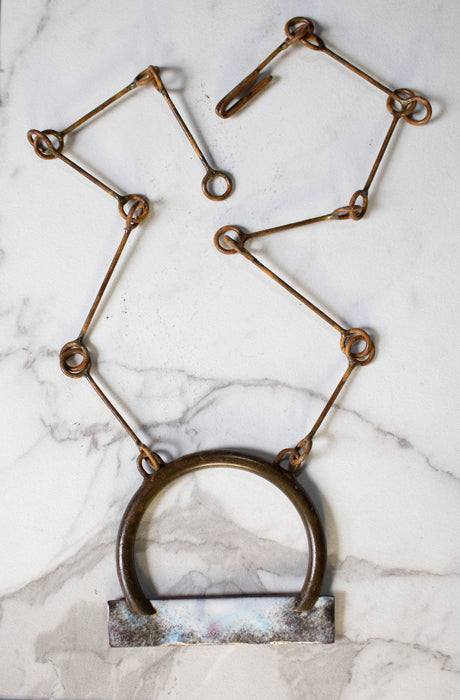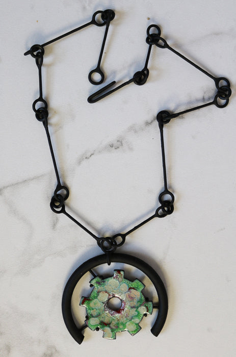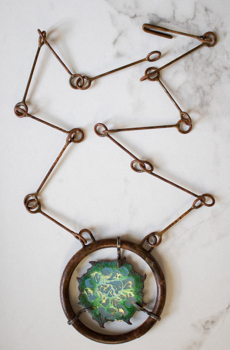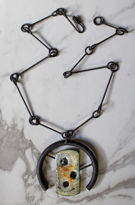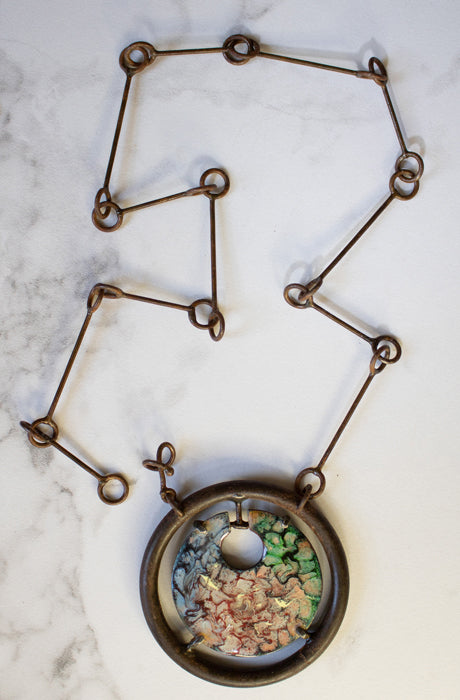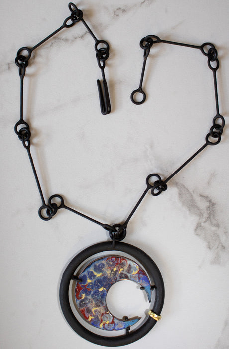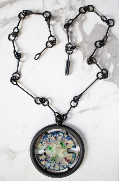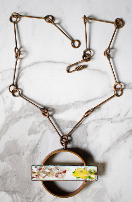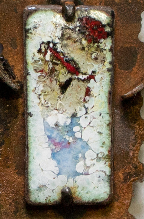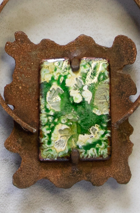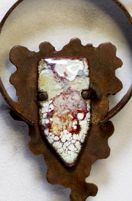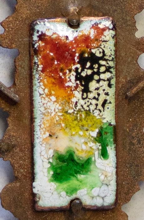 Like medieval reliquaries holding precious religious relics, these pieces of recycled steel protect these colorful enamel abstracts. Each piece a one of a kind done in a style basic and savage, without the refinements of the modern world, appealing directly to our primitive emotions.