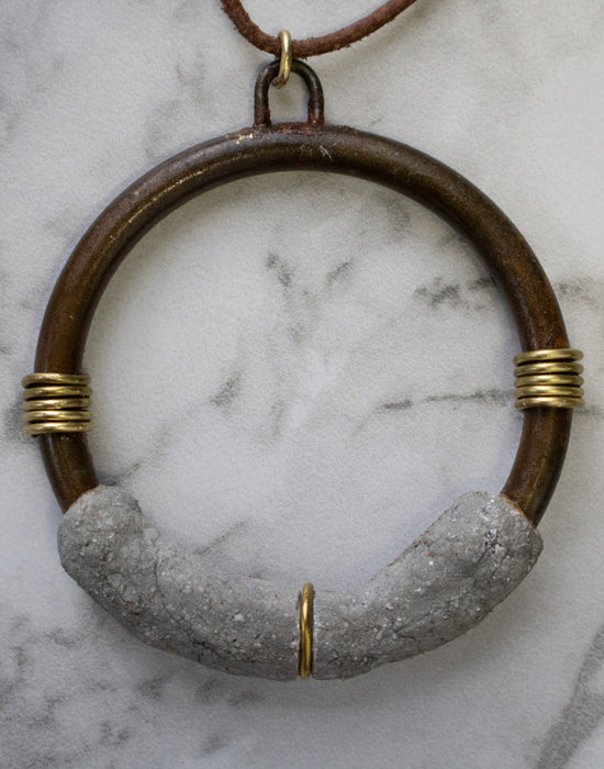 This unique steel, brass and concrete pendant is made with recycled steel. The concrete has been cast and shaped directly on the steel. The rust patina is sealed for a smooth finish contrary to its rough appearance.