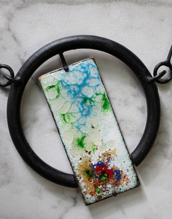 This very colorful torch-fired enamel on copper center piece is held in a unique steel pendant. Made from recycled steel this handmade pendant and chain have a hand applied baked on deep black powder coating.
